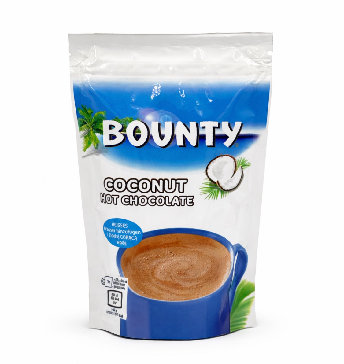 Bounty Coconut Hot Chocolate to napój kakaowy w proszku o smaku kokosowym, inspirowany popularnym batonem Bounty. Produkt przeznaczony do przygotowania gorącego napoju poprzez zalanie gorącą wodą lub mlekiem.